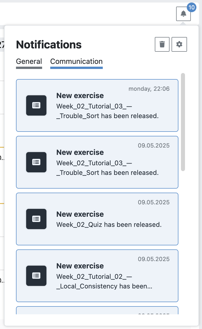 Artemis offers customizable notifications through multiple channels: web, email, and push notifications. Users can enable or disable specific notification types in their user settings. All notifications are specific to each course and can be accessed within the course interface.