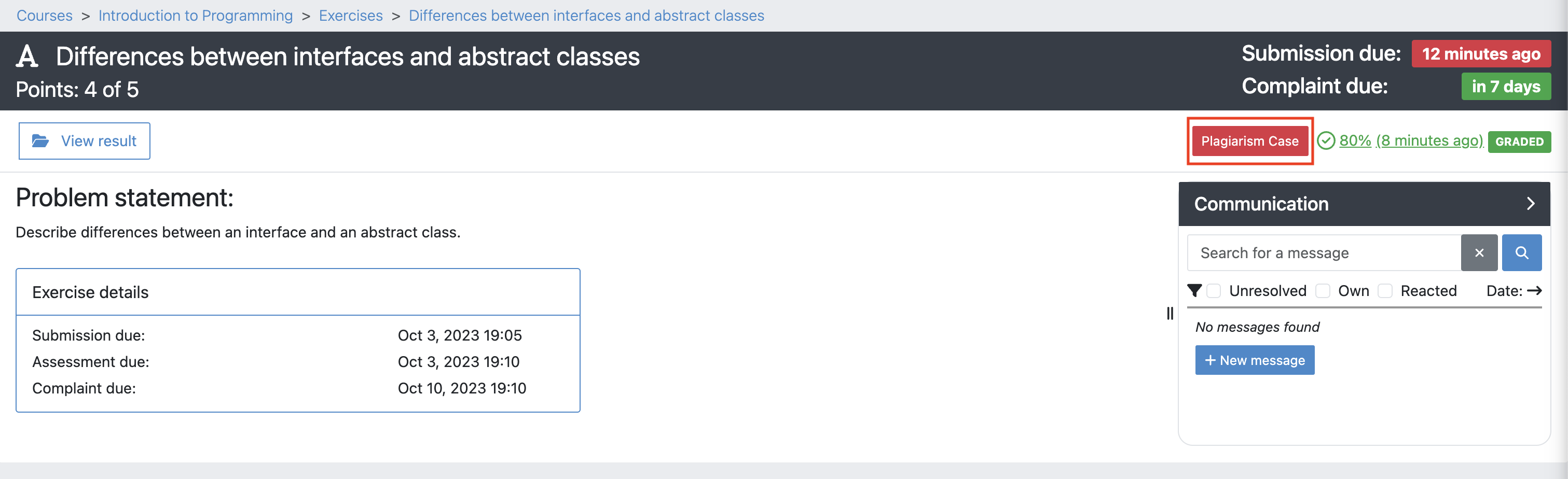 In case the exercise due date has passed and student does not agree with the significant similarity plagiarism case, the student can dispute the case within the period configured by the instructor.