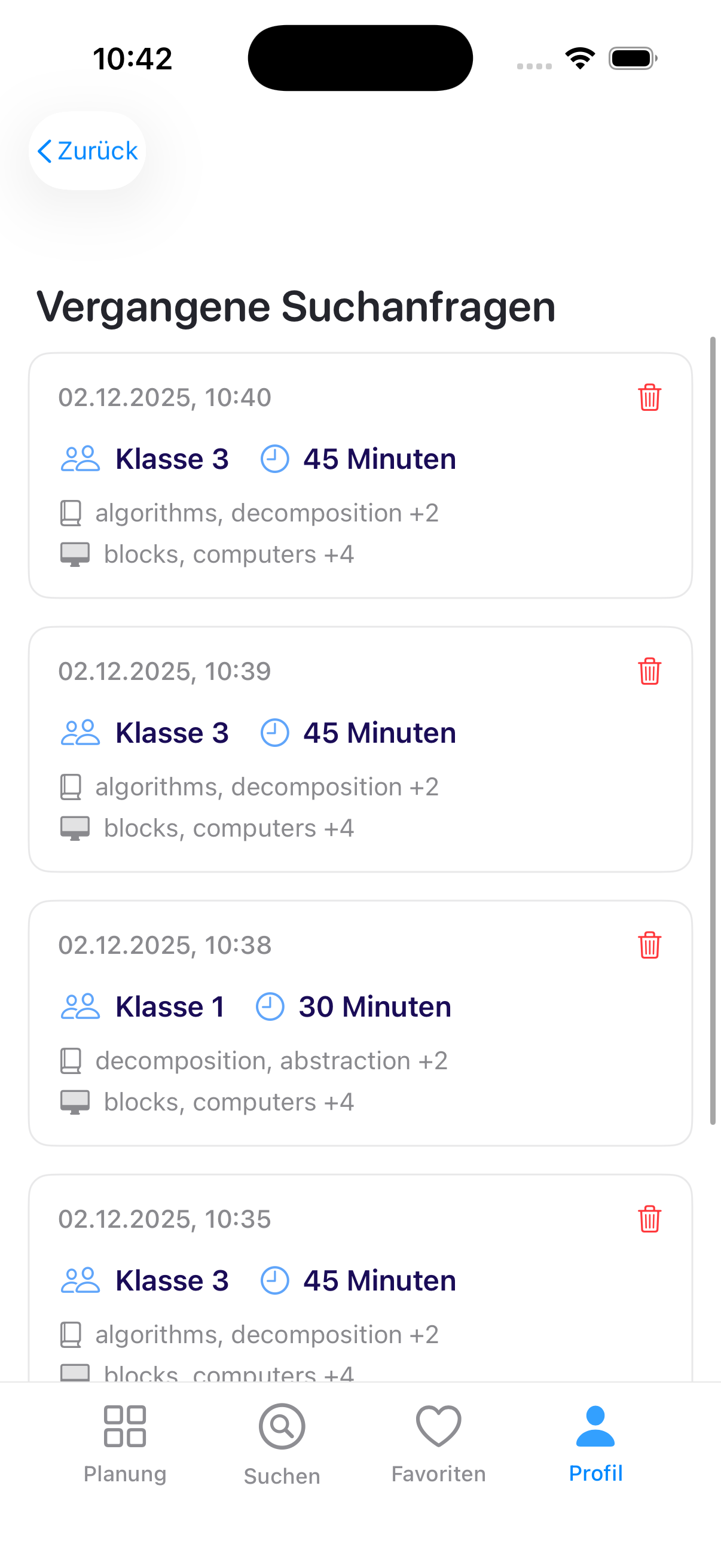 - Tap an entry to reopen it - the app automatically reloads the input parameters and displays the corresponding results.
