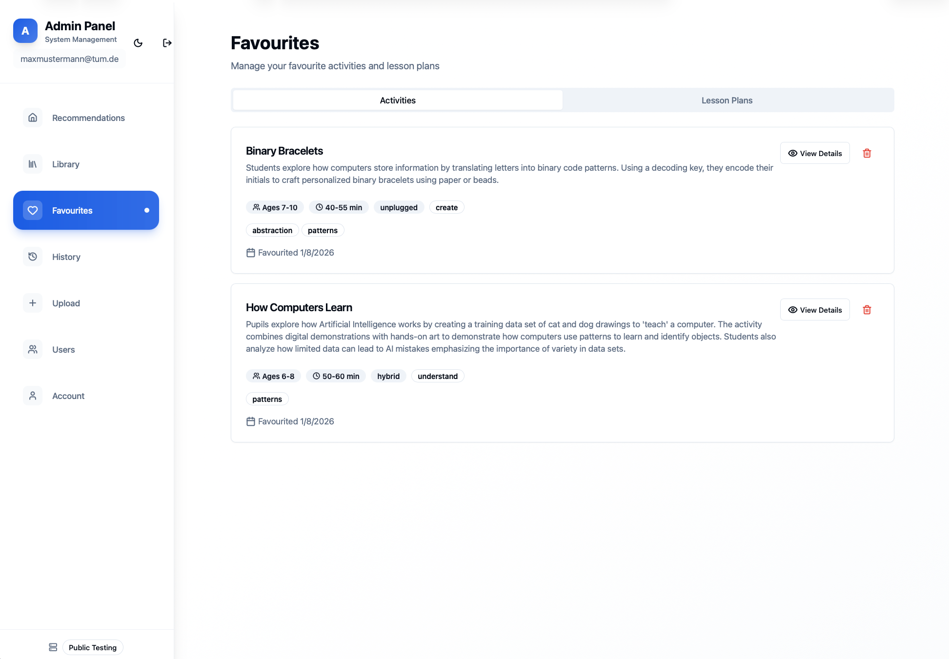 - Lesson plans – Save complete recommendations with breaks and timing intact