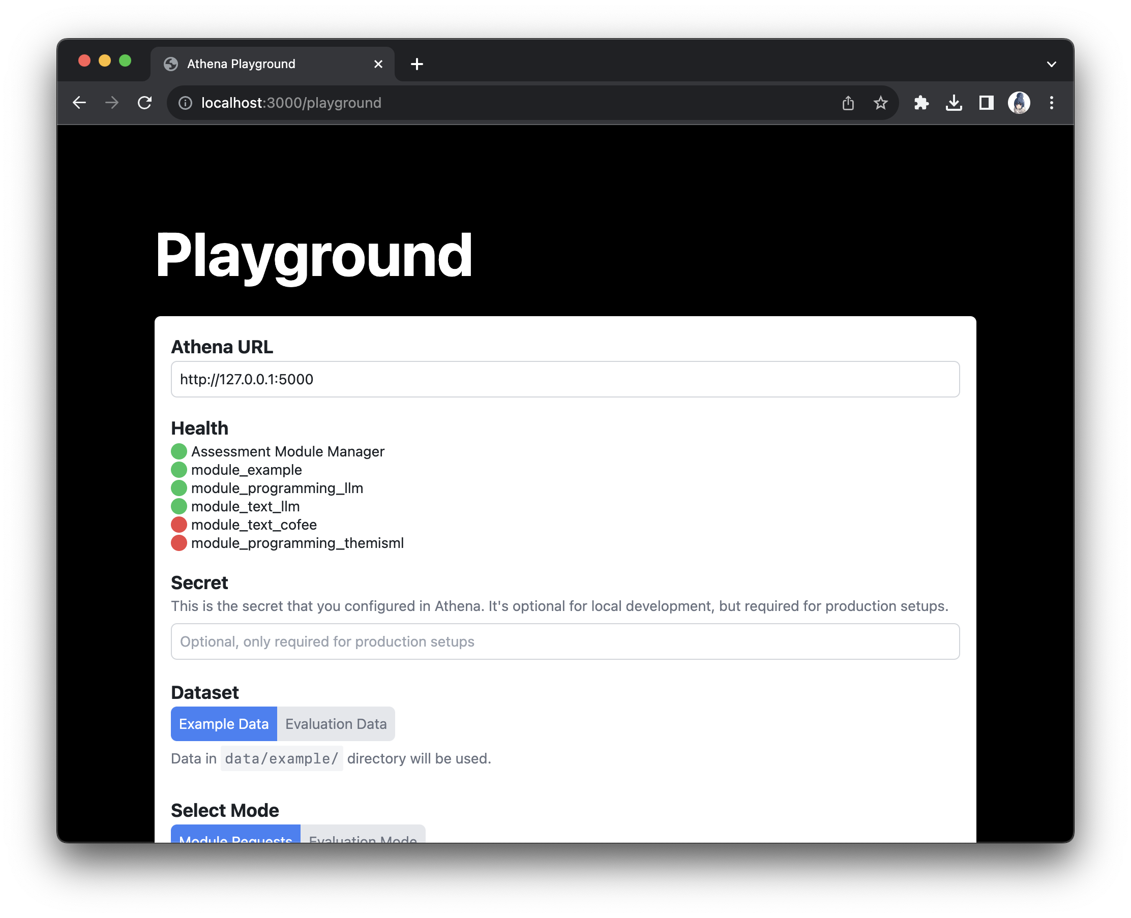 Athena includes a playground that allows you to run and test your modules requests and offers an evaluation mode to test your module extensively.