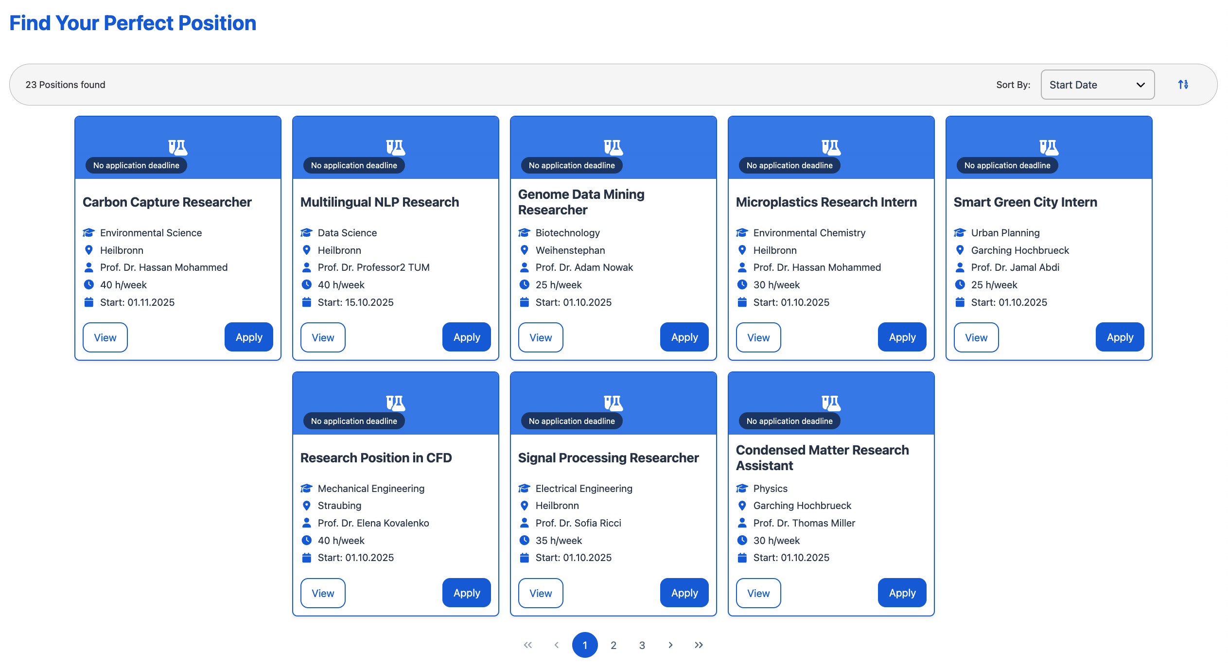 The Find Positions page enables doctoral applicants to explore available opportunities, evaluate position details, and submit applications through an intuitive interface designed for effective job matching.