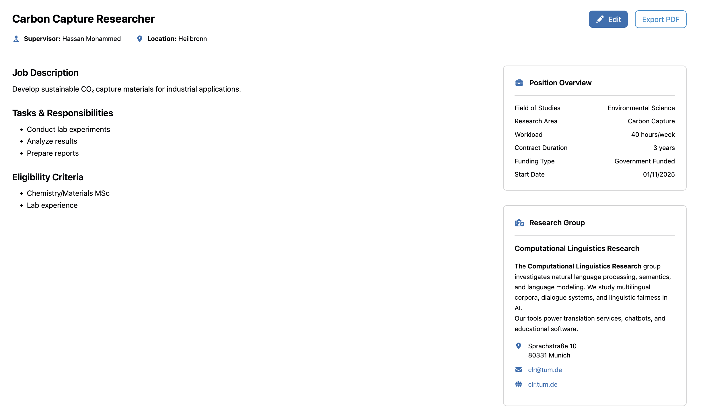 - Position Title: Clear job descriptions (e.g., "EdTech Interface Designer", "Carbon Capture Researcher")