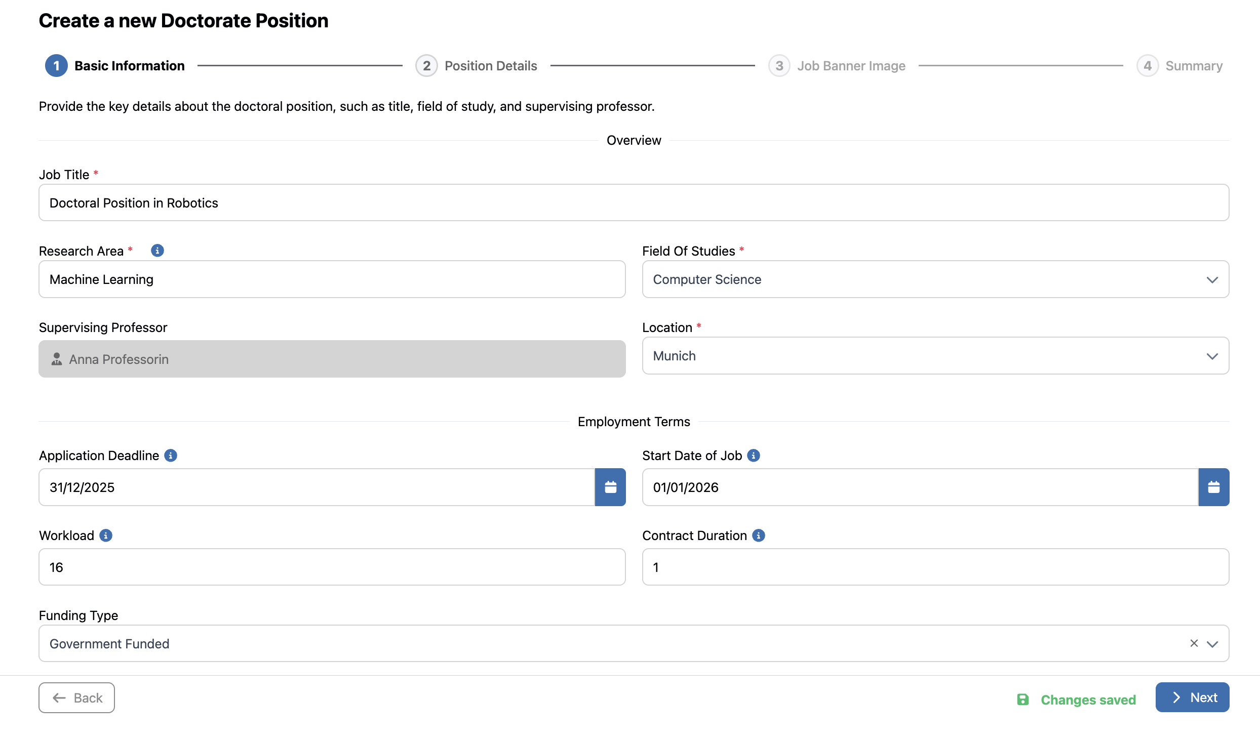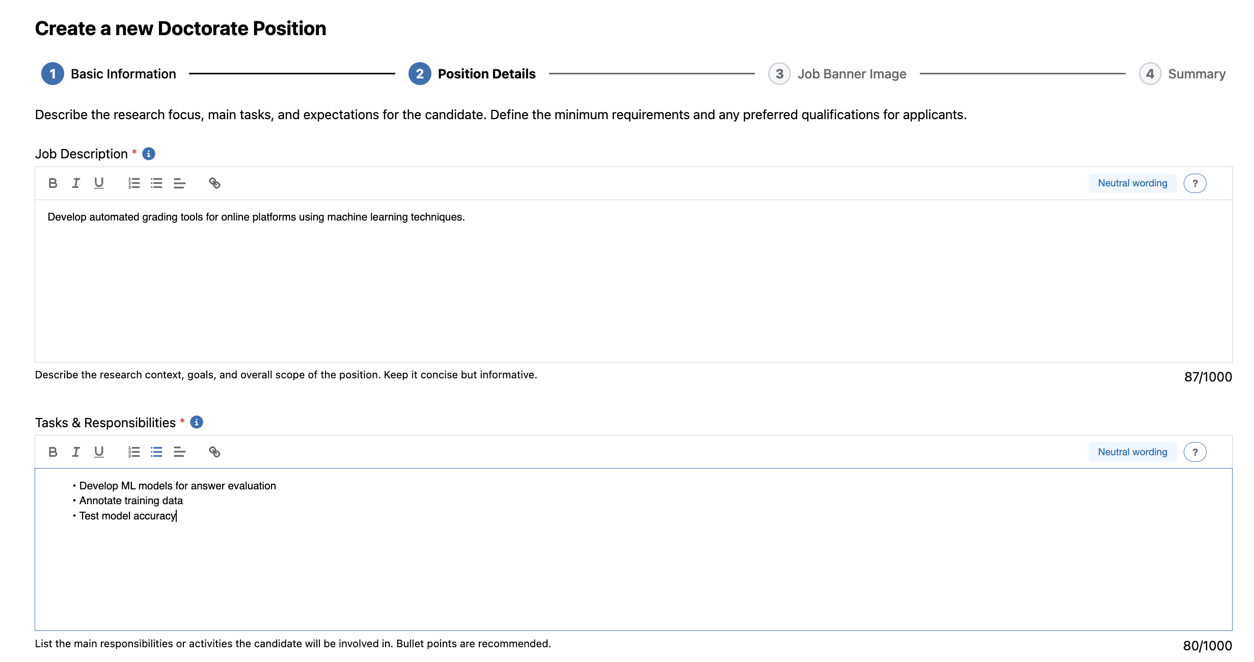 The Job Creation Form provides comprehensive tools for professors to develop compelling doctorate position listings through a structured, multi-step process that ensures all essential information is captured effectively.