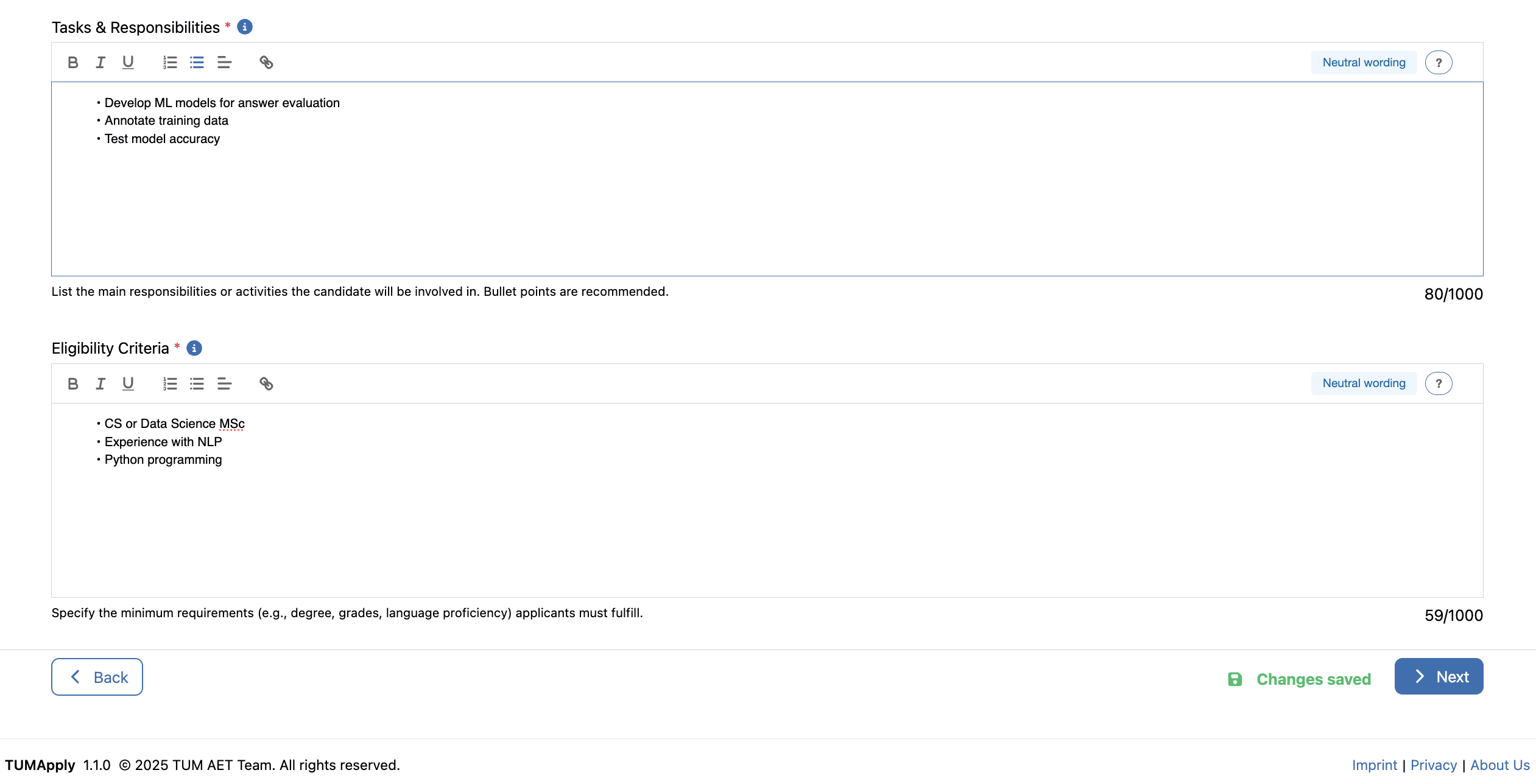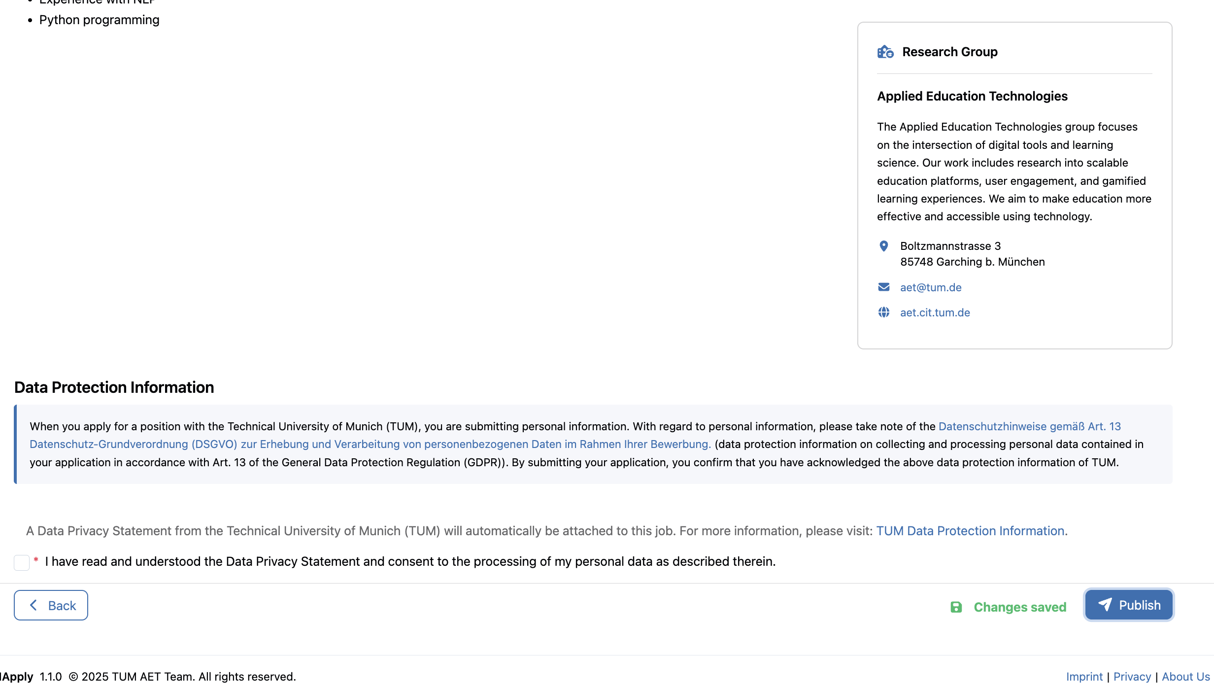 - Either publish immediately using the "Publish" button or leave the form and the position will be saved as a draft for later completion